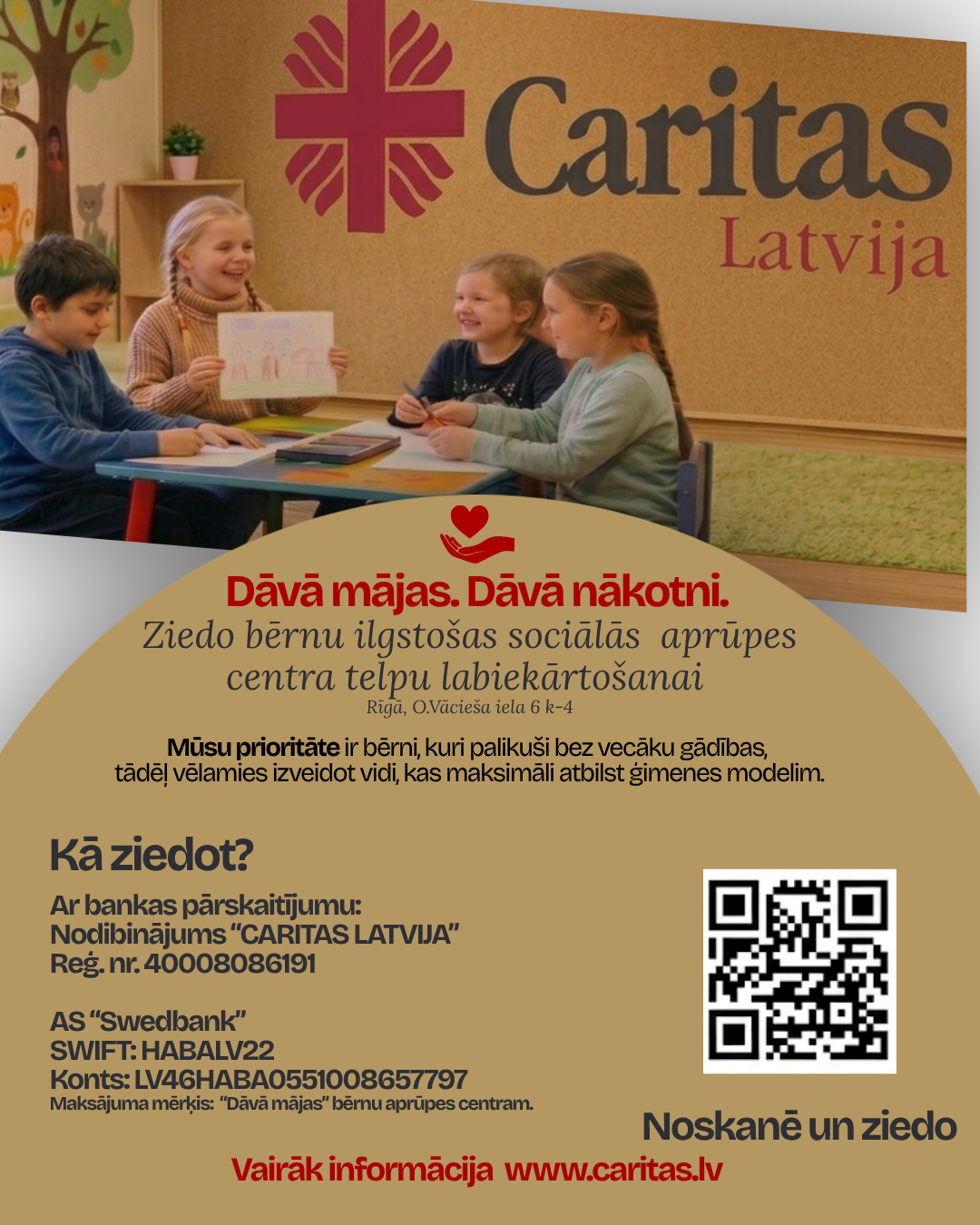Ikviens iedzīvotājs un uzņēmums ir aicināts sniegt savu artavu, veicot ziedojumu. Visi piesaistītie līdzekļi tiks novirzīti telpu labiekārtošanai un nepieciešamā inventāra iegādei.- Apmeklējiet vietni www.caritas.lv/ziedo